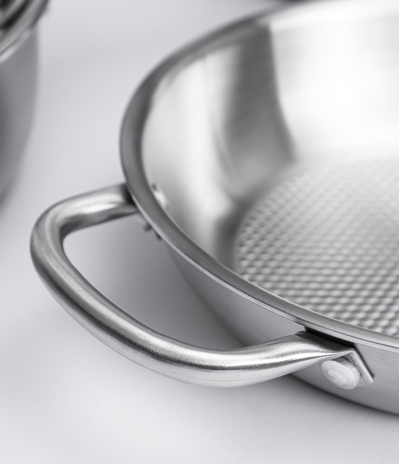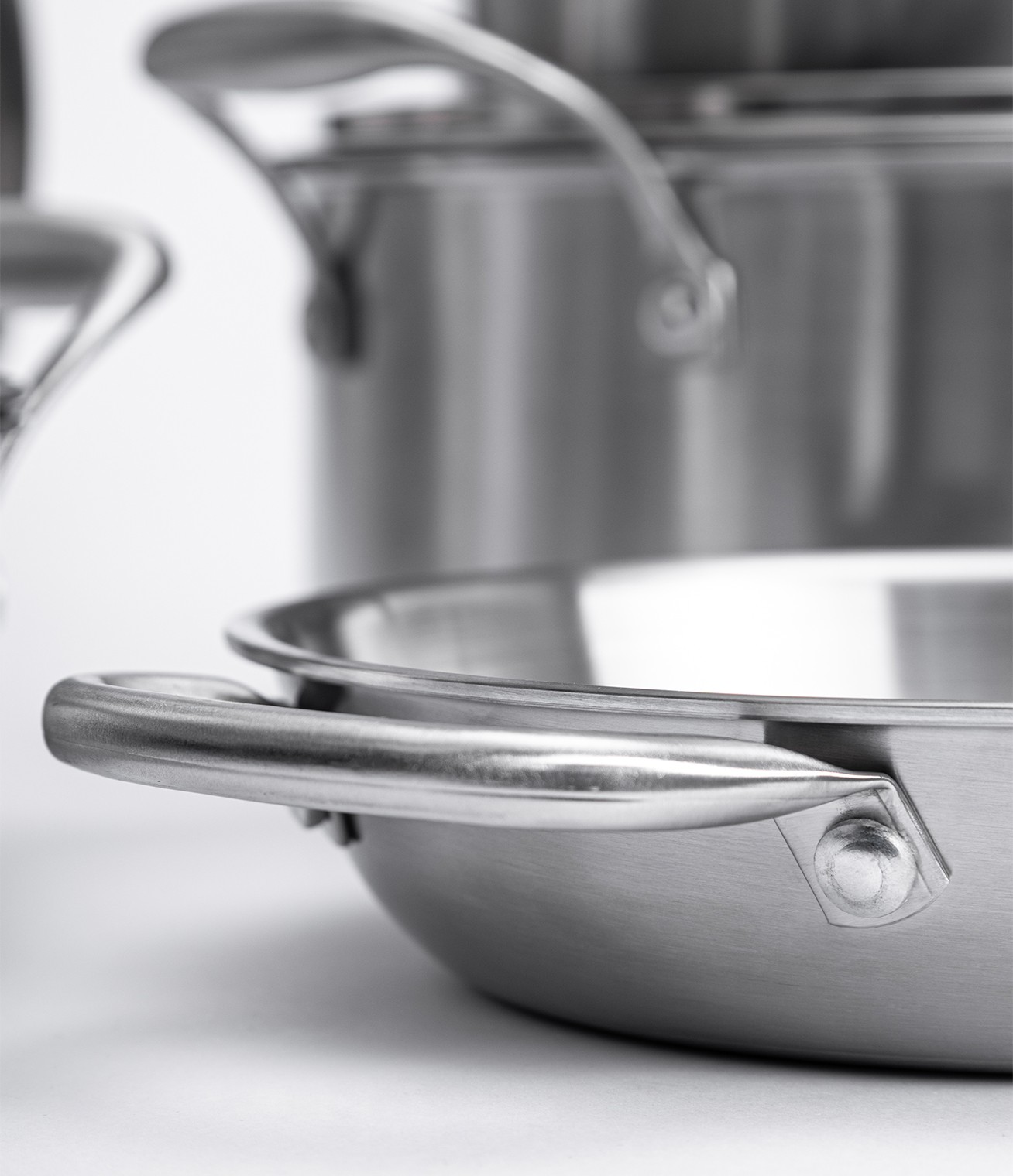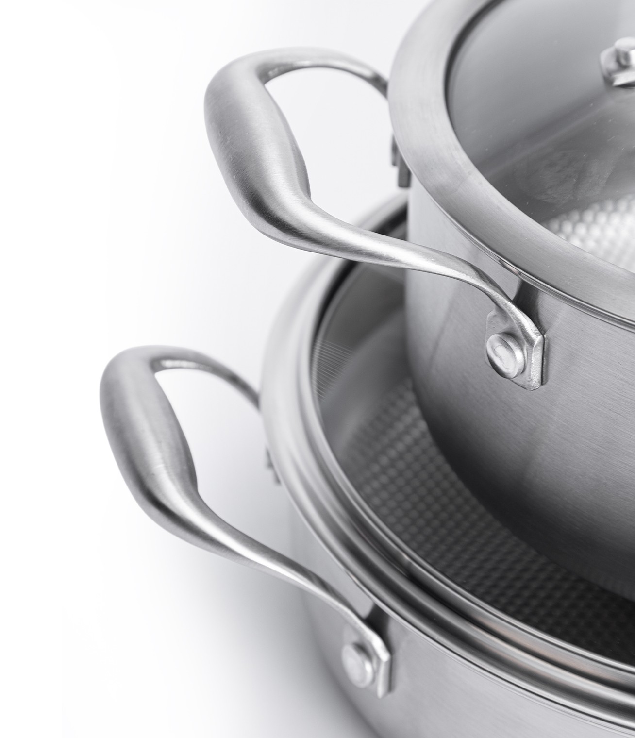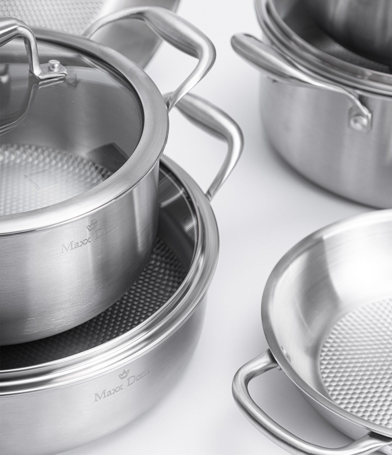 Steel Castor 10 parça set, mutfakta her tür yemeği kolay ve kontrollü bir şekilde hazırlamanız için tasarlanmış kapsamlı bir pişirme çözümüdür. 18/10 paslanmaz çelik ile üretilmiş olan bu set, derin tencerelerden basık tencere ve tavaya, kahvaltılıklar için sahana kadar geniş bir kullanım alanı sunar. Geliştirilmiş kabartmalı iç yüzeyi, yiyeceklerin yapışmasını azaltırken içindeki litre ölçüleri, tariflerinizi hassas bir şekilde hazırlamanıza imkân tanır. Cam kapaklar sayesinde pişirme sürecini takip etmek kolaydır. 3 katlı gövde yapısı ise ısıyı hızla ve eşit dağıtarak yemeklerin tüm noktalarında aynı kıvam ve lezzeti sağlar. Derin tencereler çorba, bakliyat ve uzun süreli pişirmeler için; basık tencere soteleme ve kavurma için; tava ve sahan ise mühürleme, kahvaltılık ve hızlı pişen tariflerde ideal performans sunar. Tüm parçalar, tüm ocak tipleriyle uyumlu taban yapısı sayesinde günlük kullanımı pratik ve güvenilir kılar.