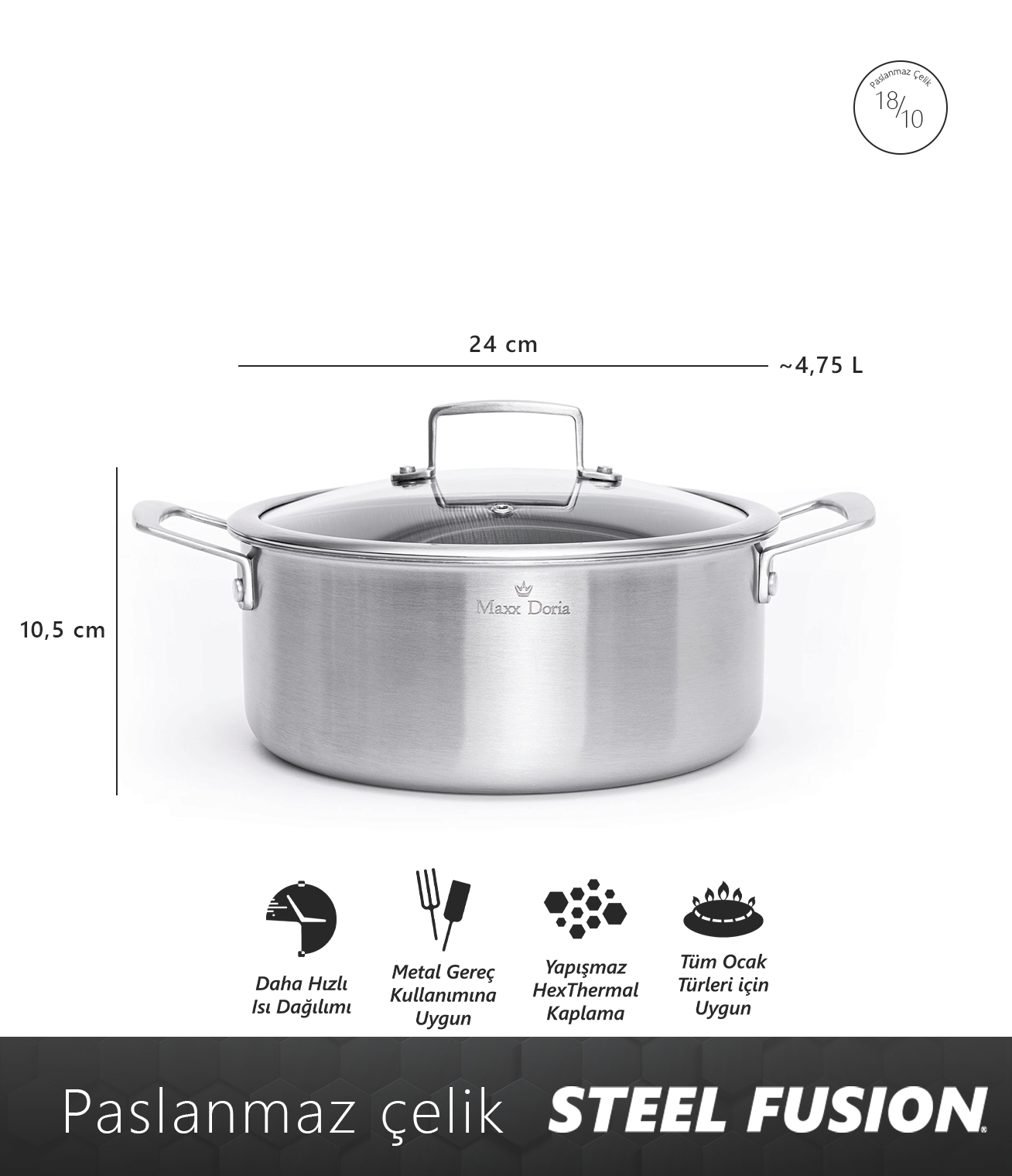 Maxx Doria Steel Fusion, yenilikçi Hexthermal hibrit teknolojisiyle geliştirilmiş bir pişirme ürünleri serisidir.