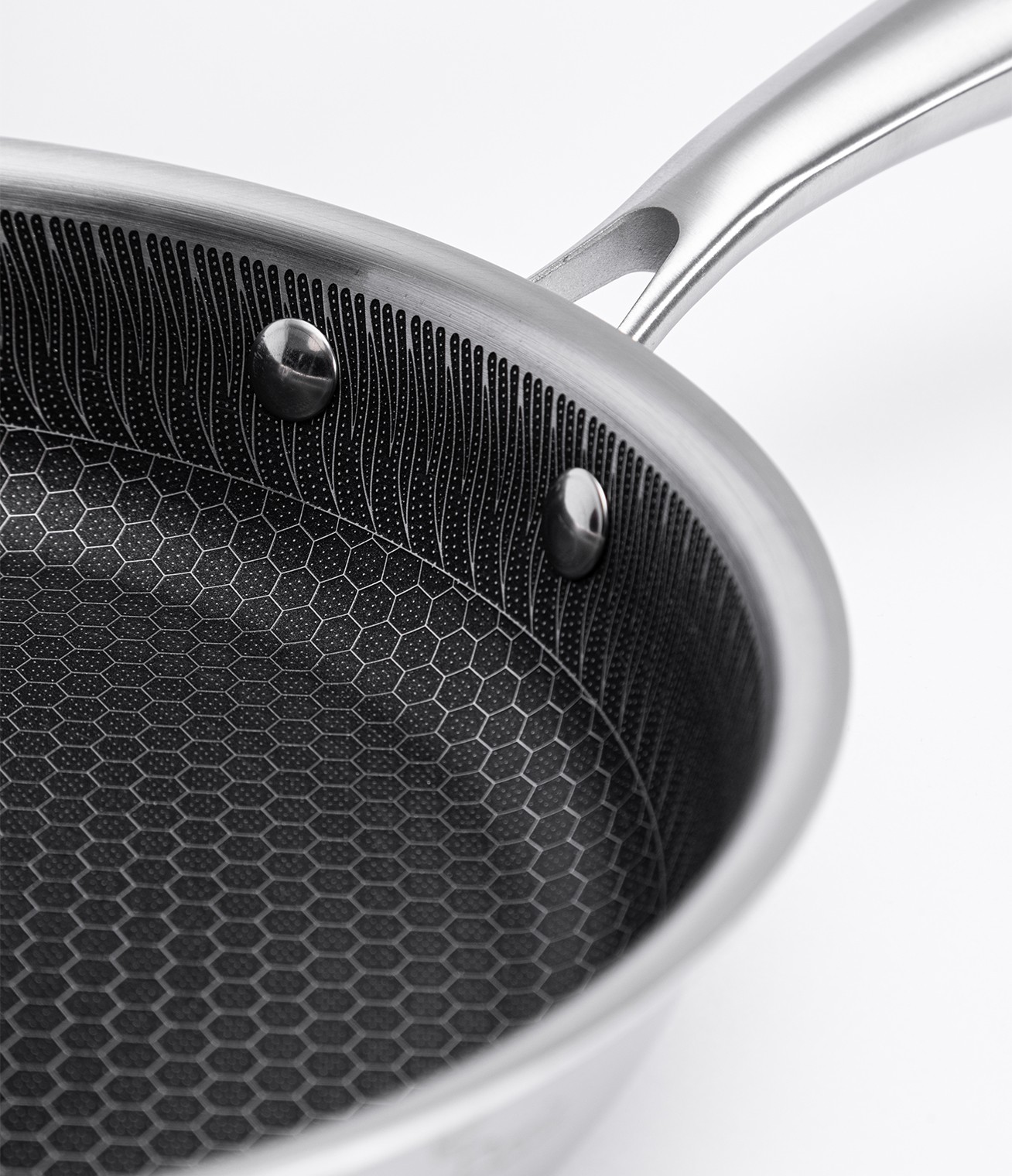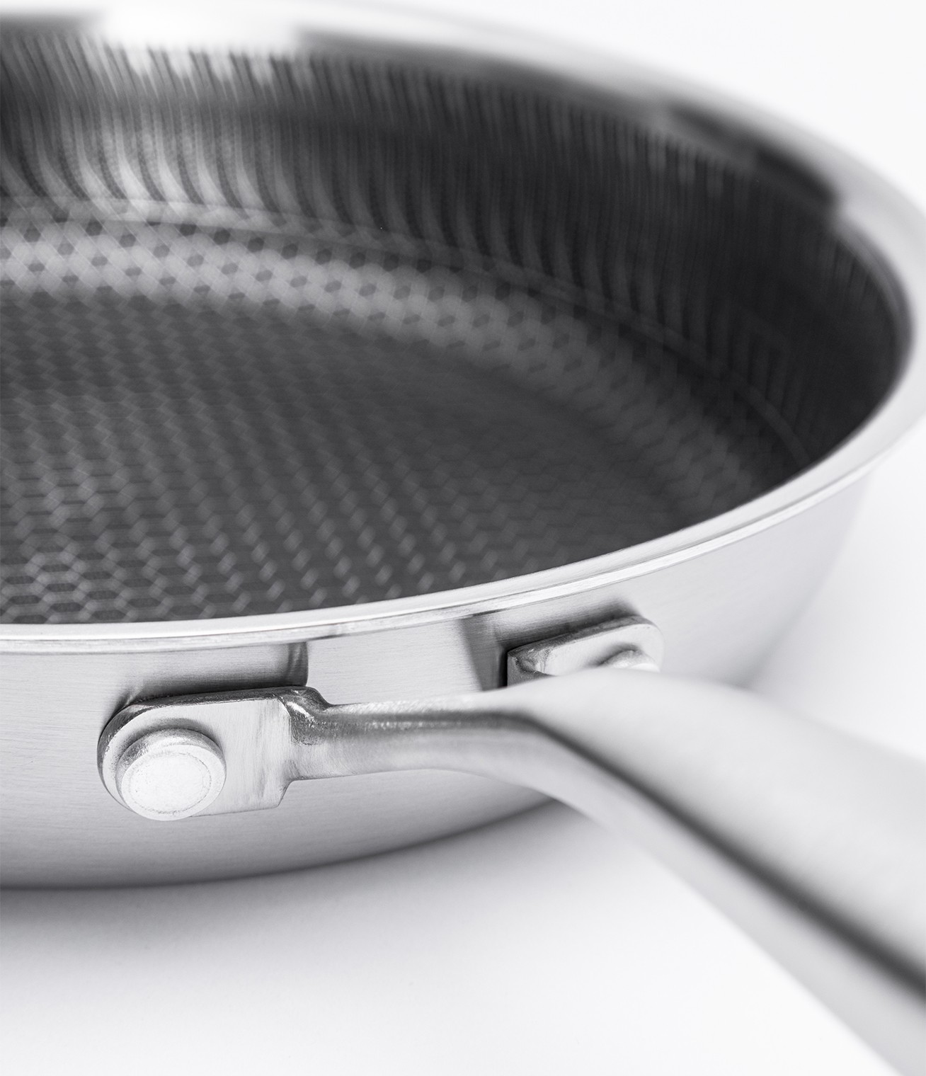 Hızlı ısınan ve ısıyı eşit dağıtan yapısıyla etten sebzeye tüm yemeklerde dengeli pişirme performansı sunar. 18/10 paslanmaz çelik ile üretilmiş olan bu ürün, özel HexaWave petek dokusu sayesinde yiyeceklerin yüzeye tutunmasını azaltır ve yüksek ısıda mükemmel mühürleme sağlar; etler ve sebzeler kısa sürede dışı kızarmış, içi sulu ve lezzetli kalır. Yapısı, yiyeceklerin kolay çevrilmesine imkân tanırken düşük yağla pişirmede dahi başarılı sonuçlar elde edilmesini sağlar. Tüm ocak tipleriyle uyumlu tabanı, stabil duruş ve eşit ısı yayılımı sunarak günlük pratik pişirmelerden profesyonel tekniklere kadar yüksek performans sağlar.