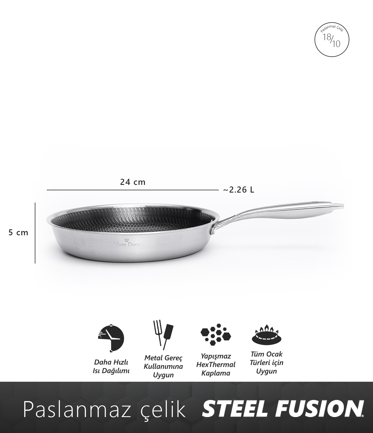 Maxx Doria Steel Fusion, yenilikçi Hexthermal hibrit teknolojisiyle geliştirilmiş bir pişirme ürünleri serisidir.