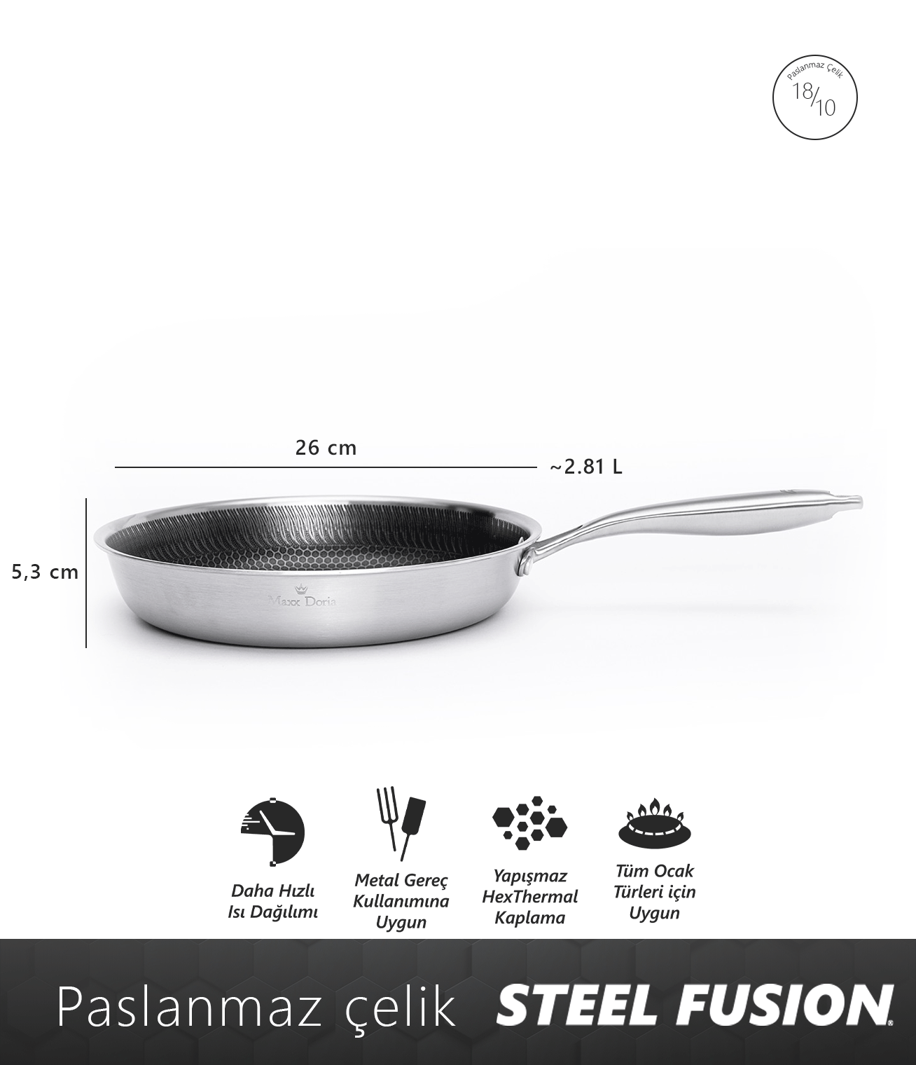 Maxx Doria Steel Fusion, yenilikçi Hexthermal hibrit teknolojisiyle geliştirilmiş bir pişirme ürünleri serisidir.