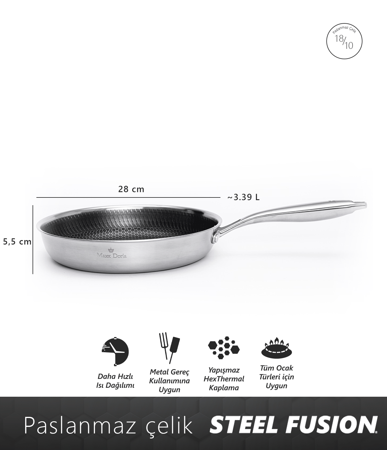 Maxx Doria Steel Fusion, yenilikçi Hexthermal hibrit teknolojisiyle geliştirilmiş bir pişirme ürünleri serisidir.