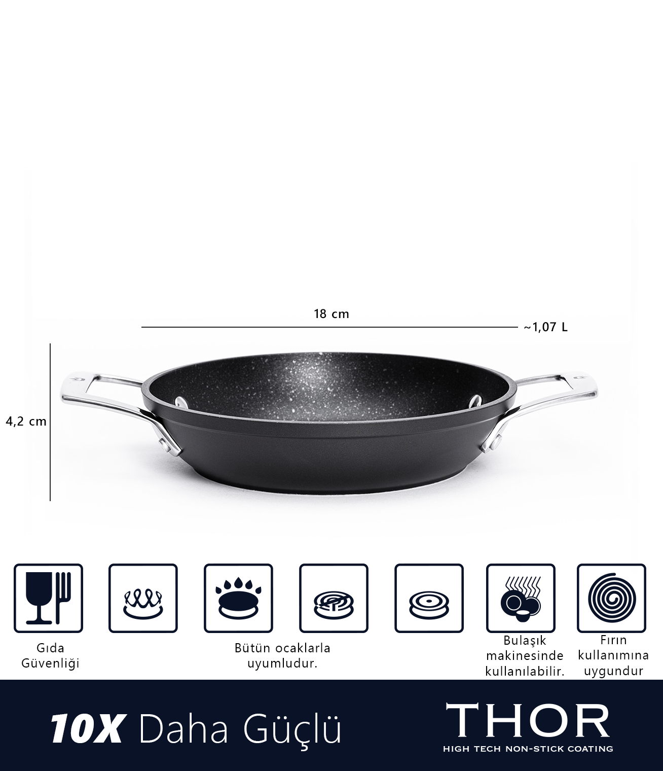 Thor sahanlar, omlet, yumurta, menemen ve küçük kızartmalar için hızlı ve pratik kullanım sunar. Yapışmaz yüzeyi sayesinde yemekler tavaya yapışmaz, temizliği kolaydır. Kahvaltıyı hızlı ve kontrollü hazırlamak isteyenler için ideal bir tercihtir.
